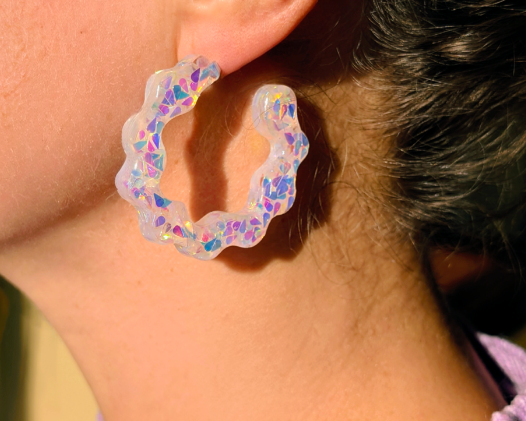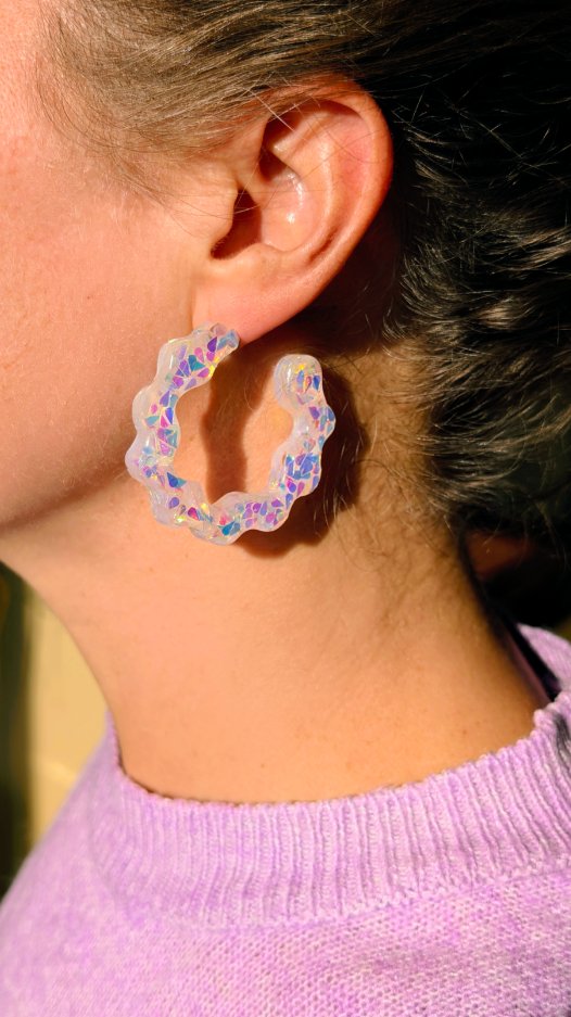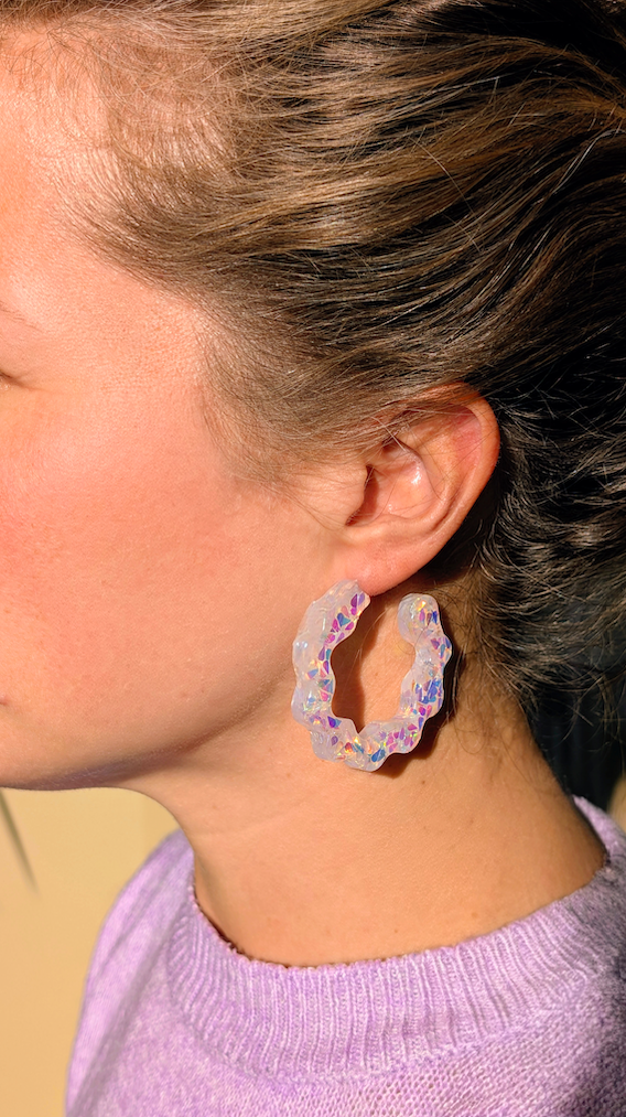 Paire de créoles huggies en résine contenant des paillettes holographique.