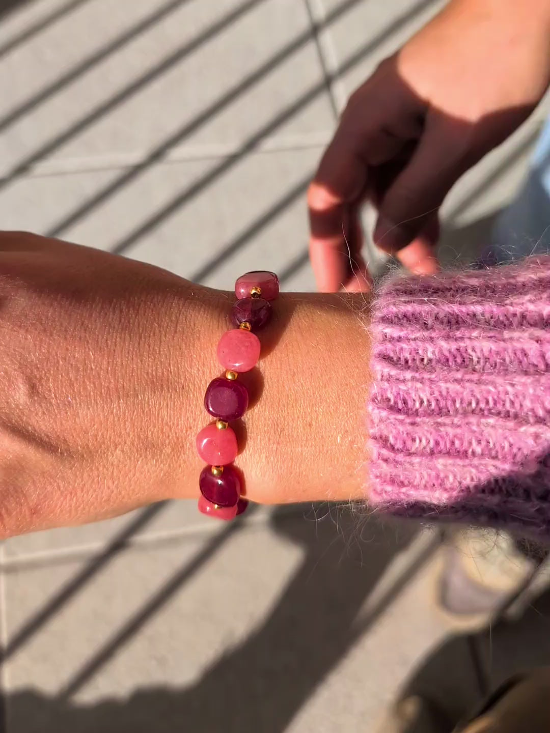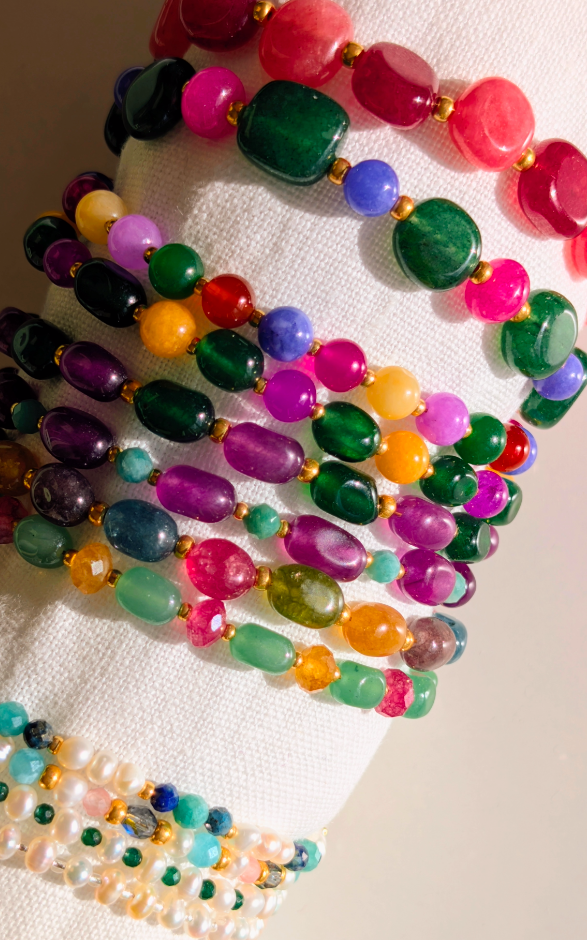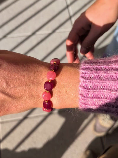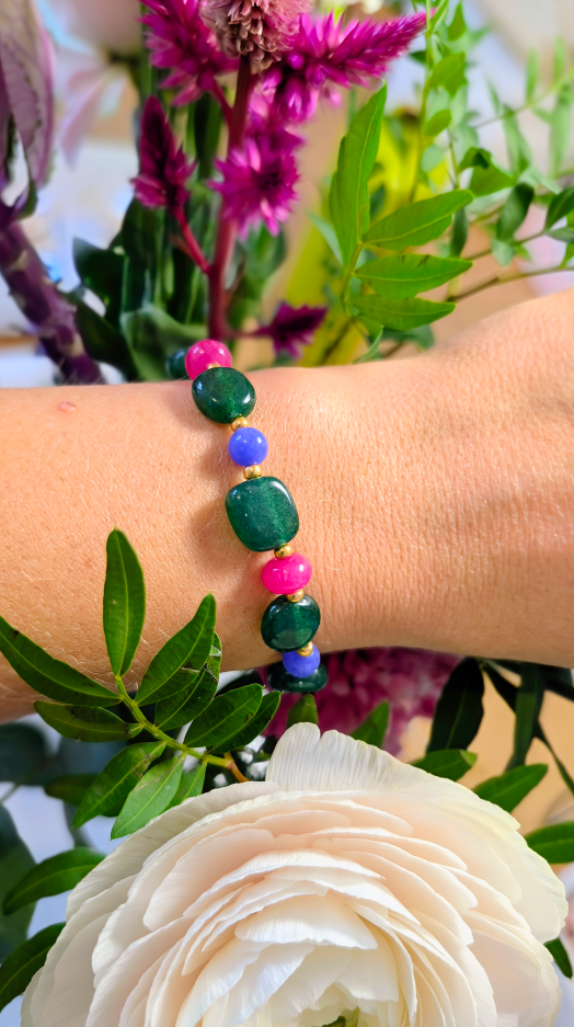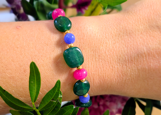 Bracelet léger, confectionné à partir de calcédoine verte, bleue et framboise.
