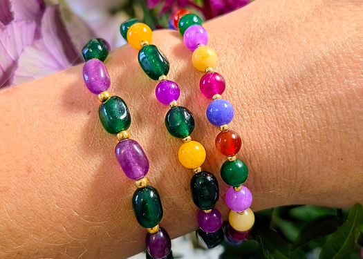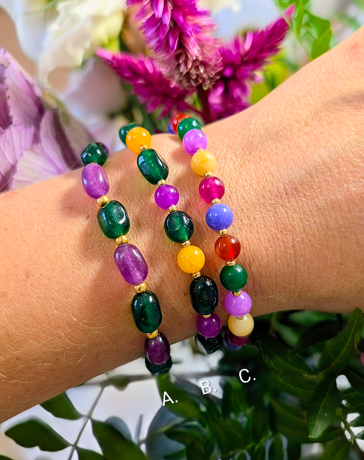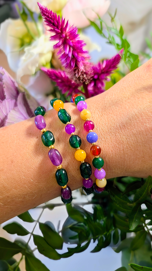Bracelet léger, confectionné à partir de calcédoine multi couleurs et perles de verre.