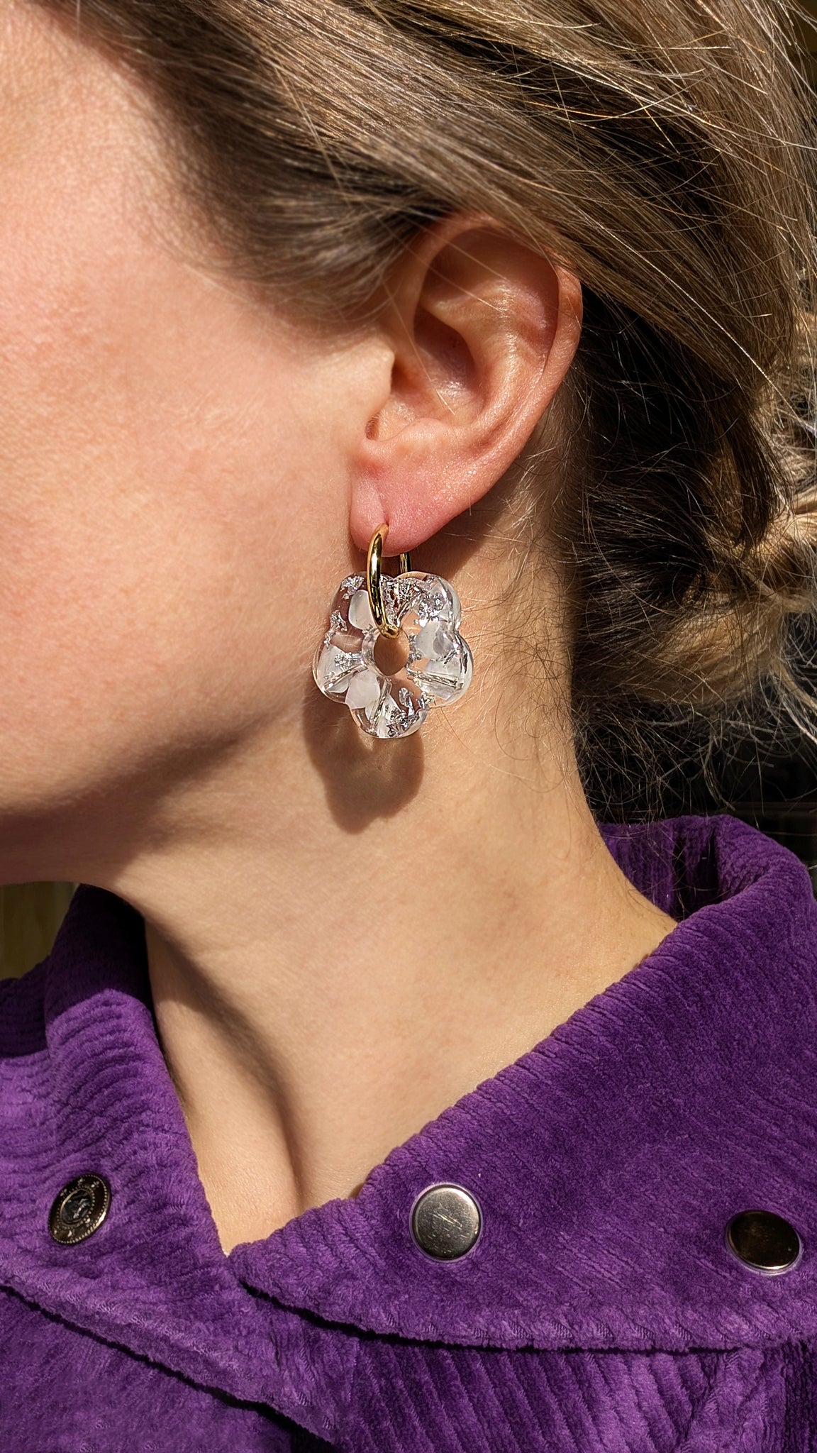 Paire de boucles d'oreilles en résine contenant des pépites de coquillages nacrés, feuille d'argent et perles tubes argentées.