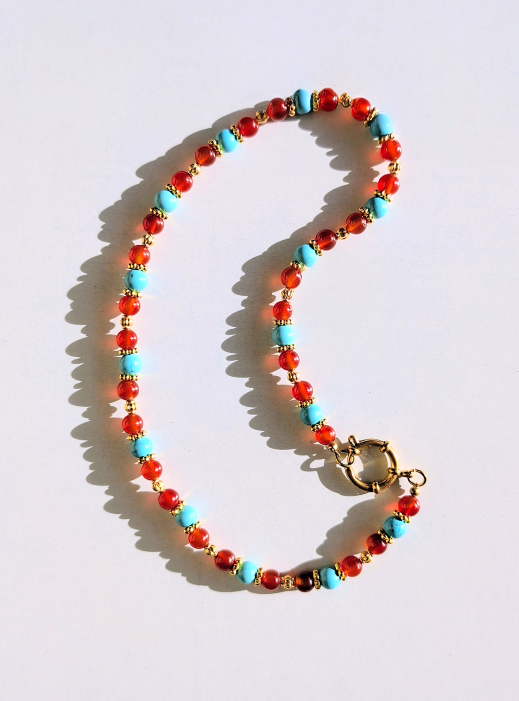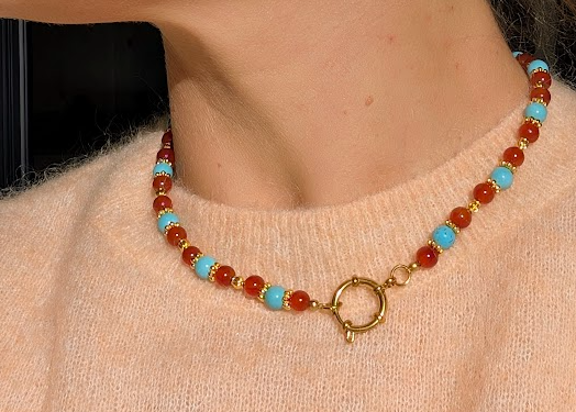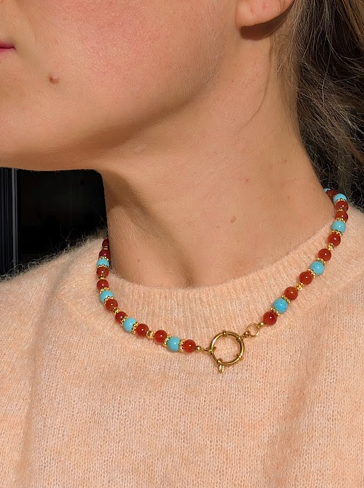Collier léger, confectionné à partir de perles de pierres semi-précieuses : de Calcédoine turquoise et de verre ambré.