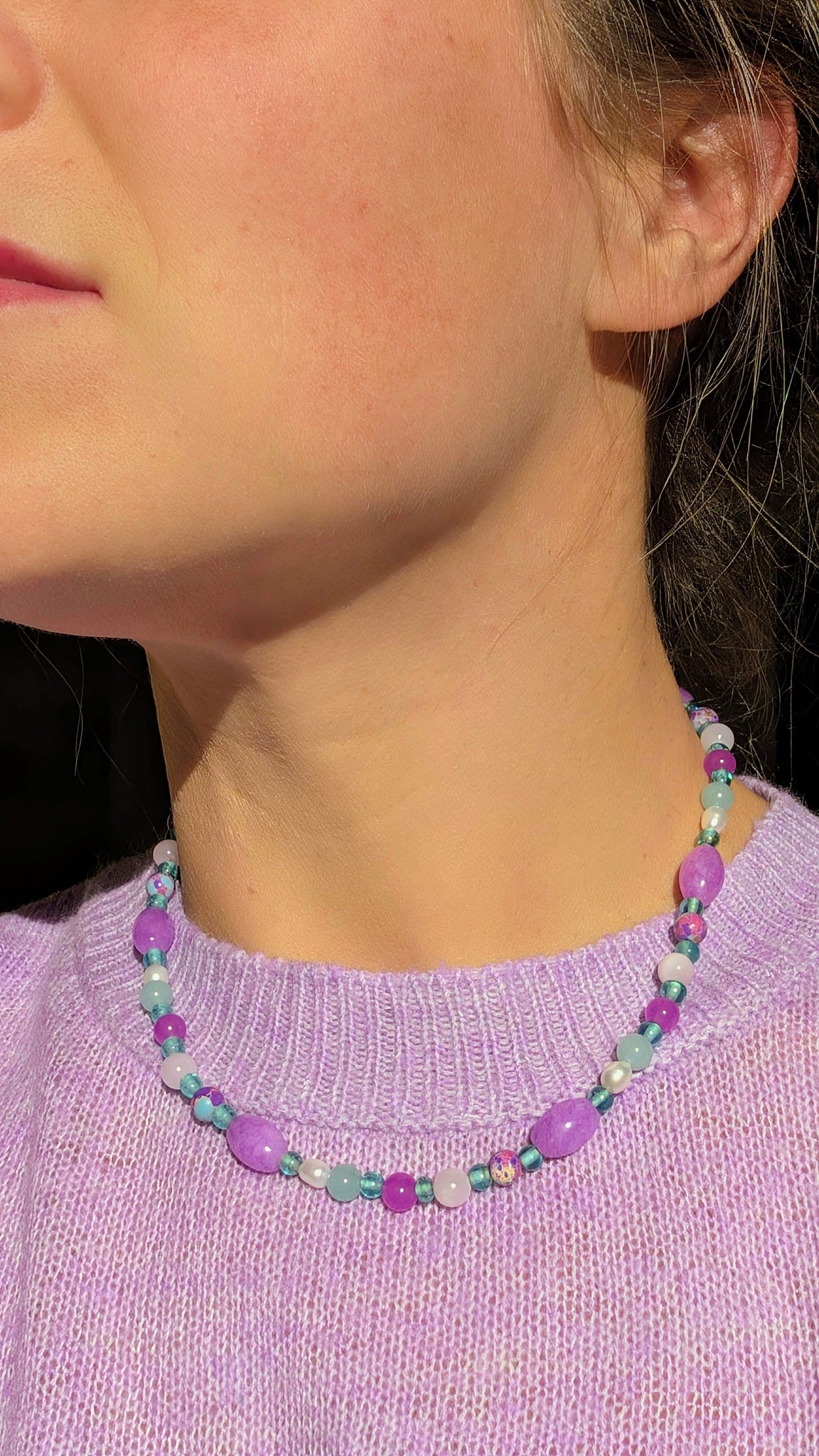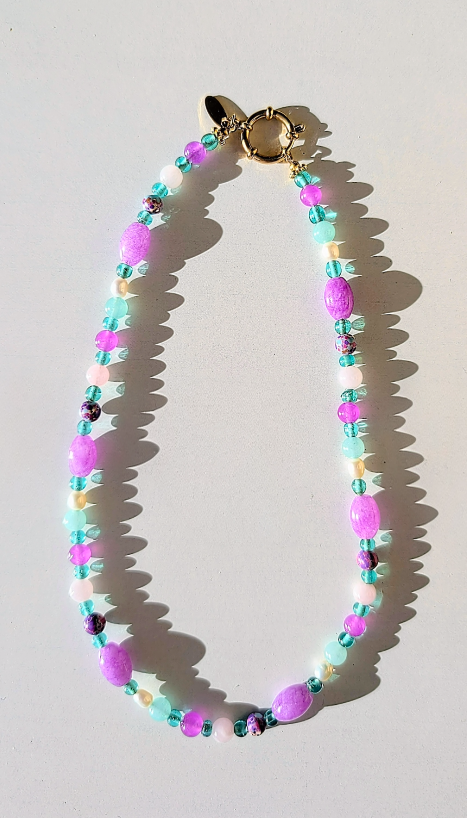 Collier léger, confectionné à partir de perles de pierres semi-précieuses : d'Amazonite, de Calcédoine parme; ainsi que de perles de verre turquoise, perles de céramiques mouchetées (violet, turquoise, beige, fuchsia) et de perles d'eau douce naturelles.