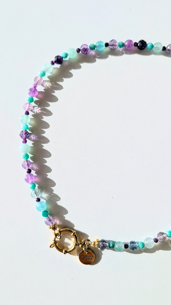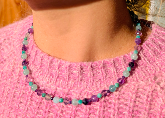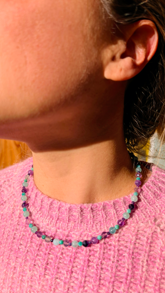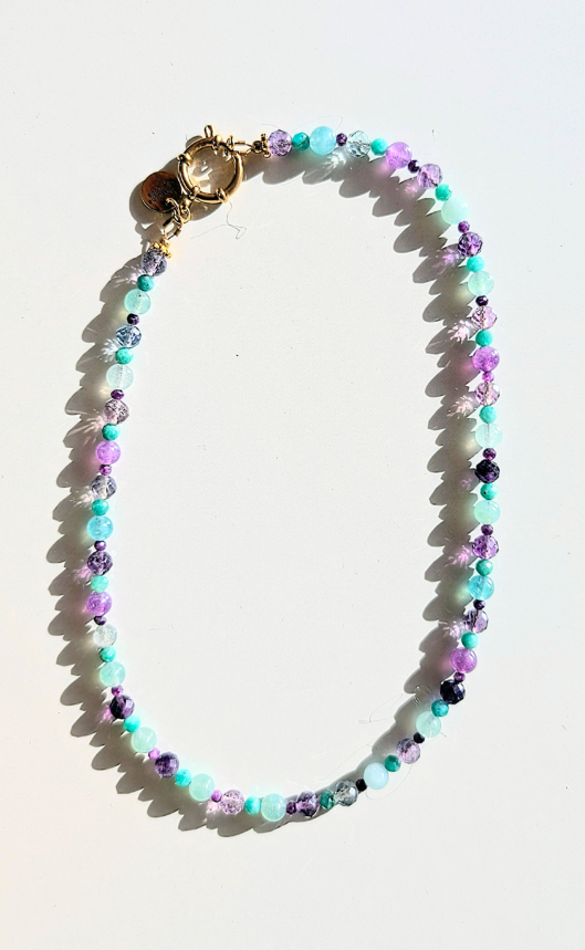 Collier léger, confectionné à partir de perles de pierres semi-précieuses : d'amazonite, d'Améthyste; et de verre.