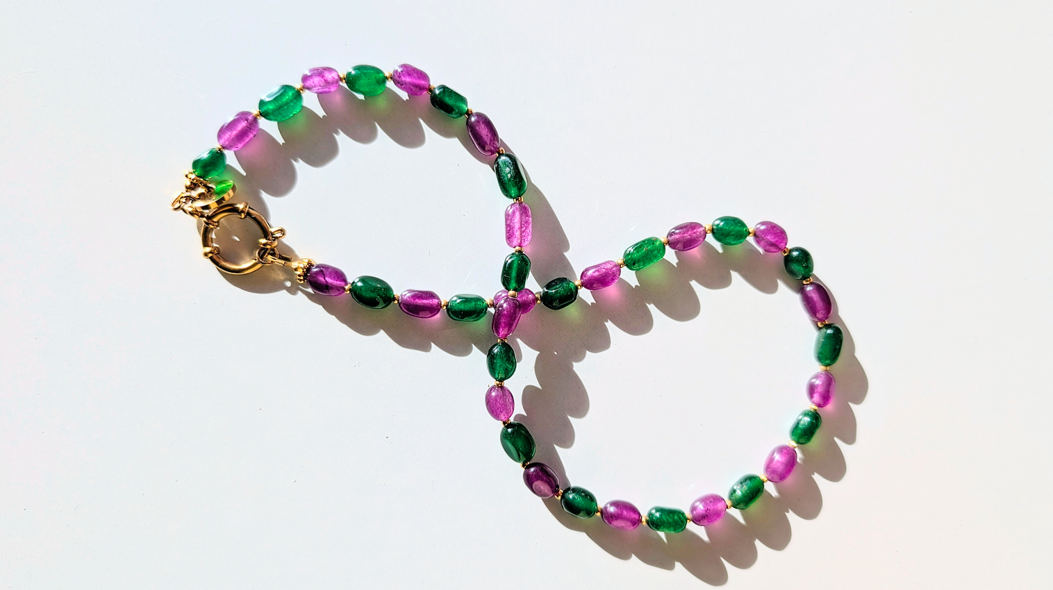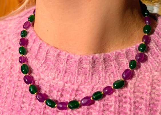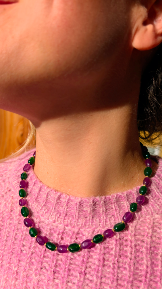 Collier léger, confectionné à partir de perles de pierres semi-précieuses : calcédoine violette & verte.