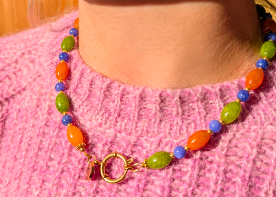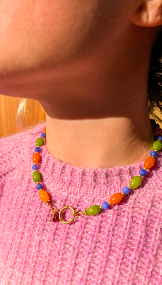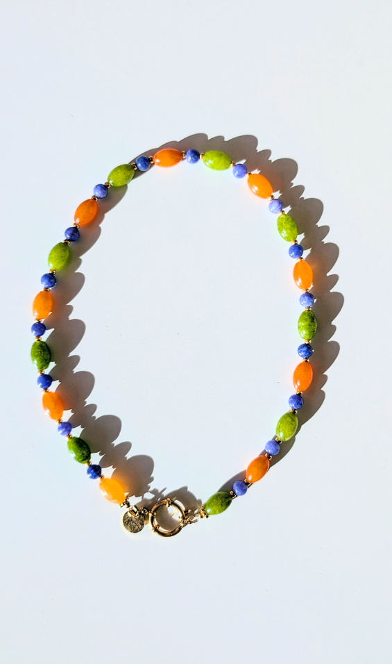 Collier léger, confectionné à partir de perles de pierres semi-précieuses : calcédoine bleue, orange et verte.