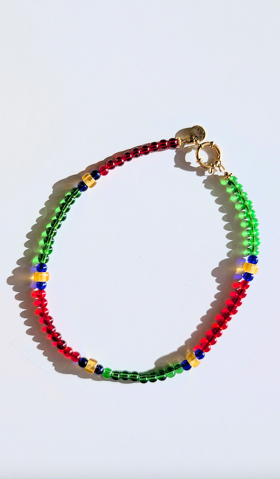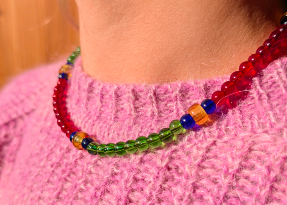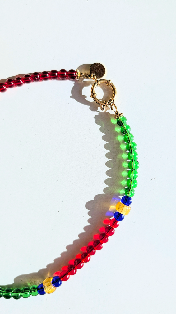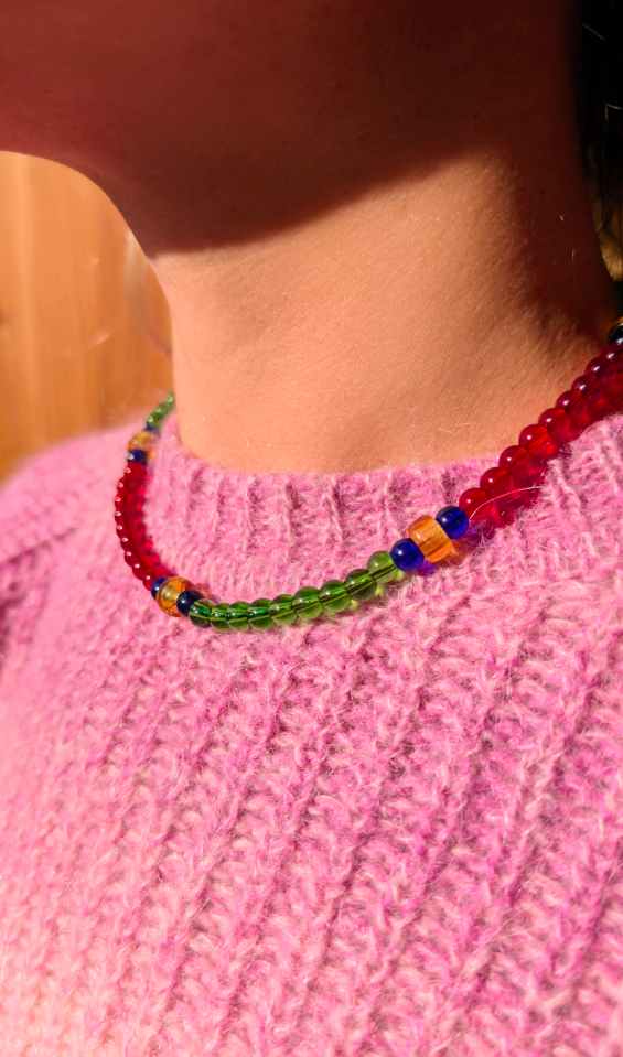 Collier léger, confectionné à partir de perles de verre.